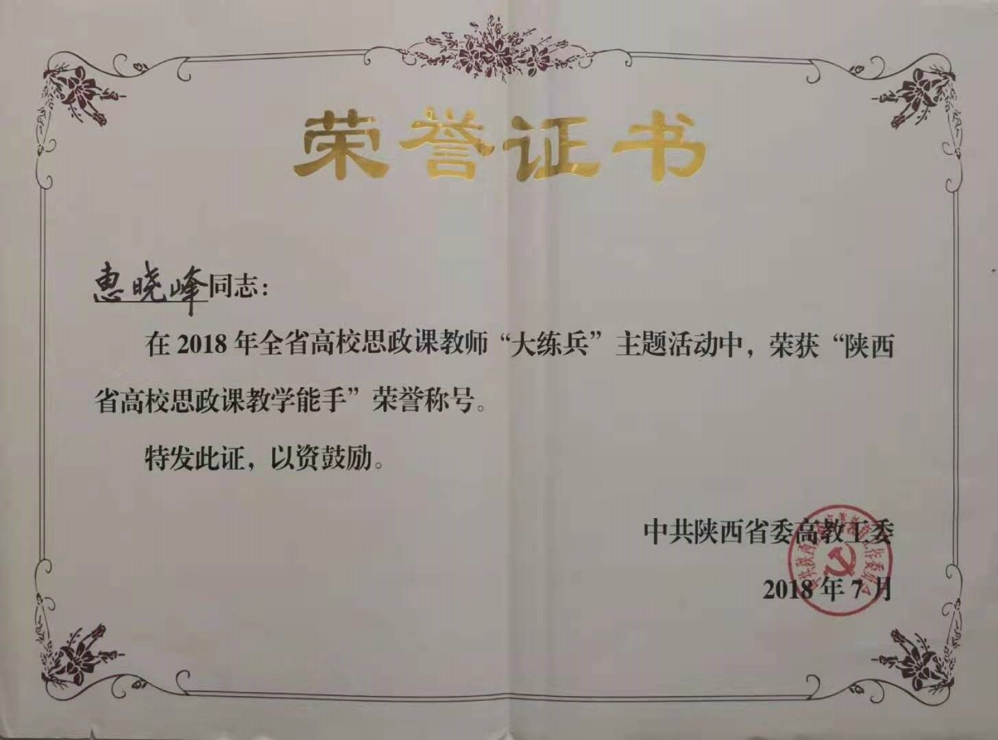 2018年全省高校思政课教师“大练兵”——惠小峰获“陕西省高校思政课教学能手”荣誉称号