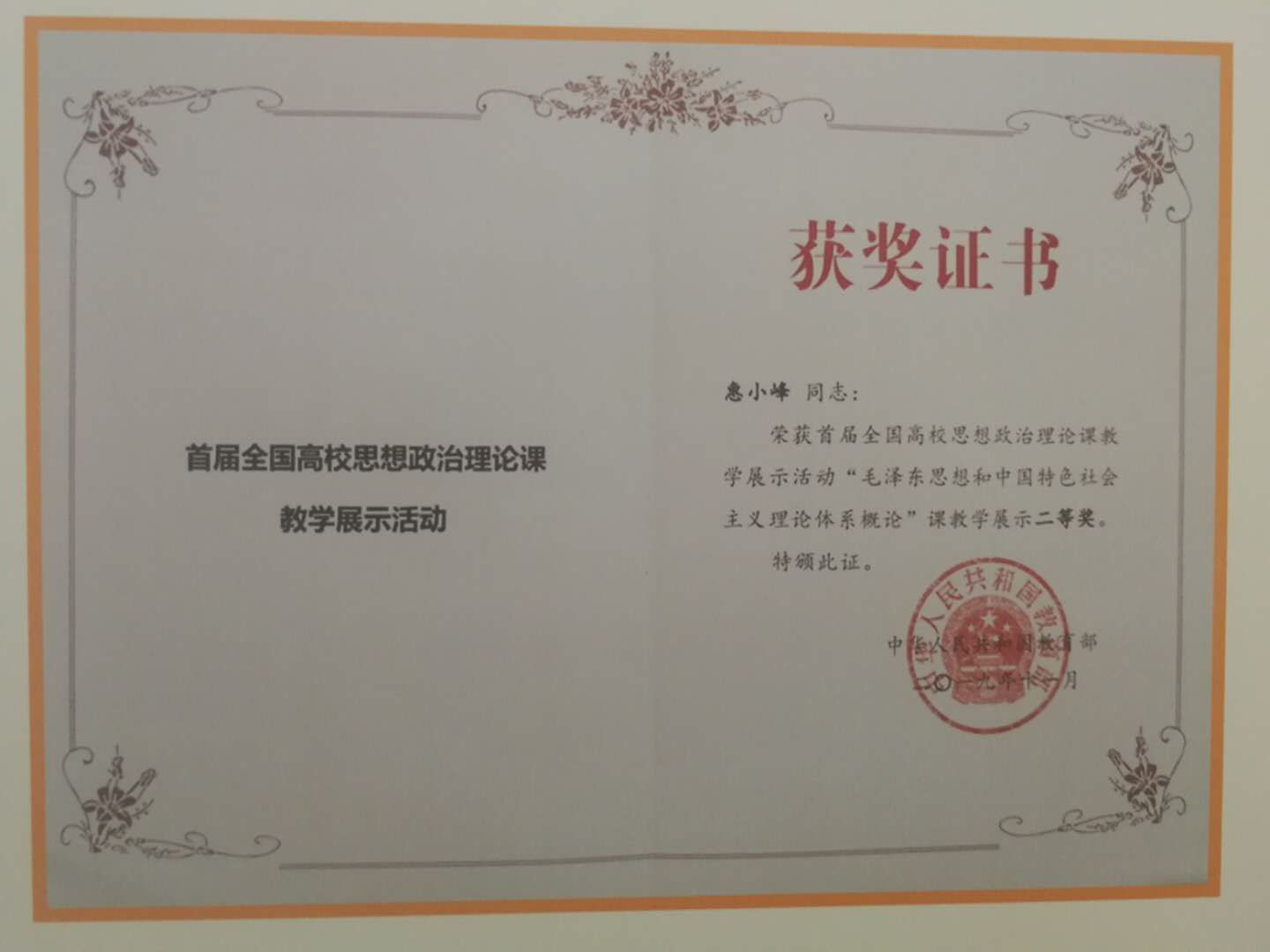 首届全国高校思想政治理论课教学展示活动——惠小峰获二等奖