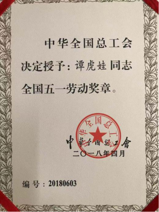 中华全国总工会授予谭虎娃全国五一劳动奖章
