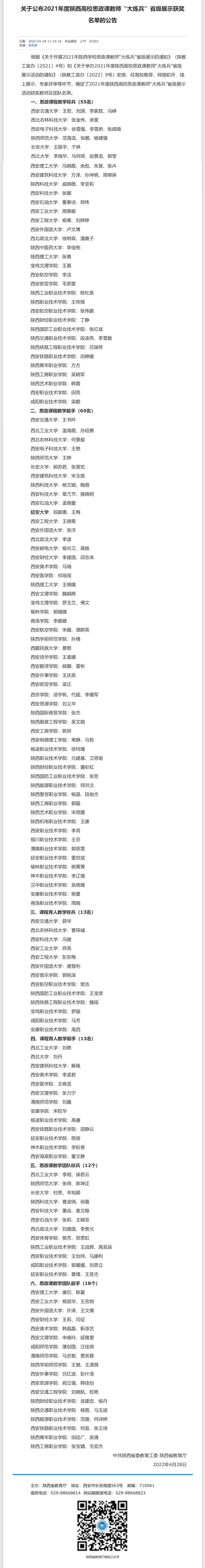 关于公布2021年度陕西高校思政课教师“大练兵”省级展示获奖名单的公告