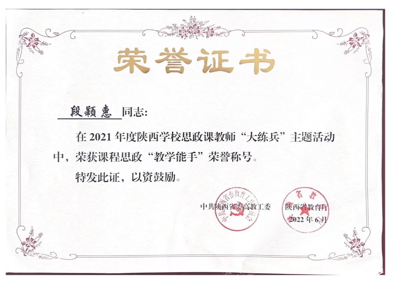 2021年度陕西公司思政课教师“大练兵”——段颖惠获课程思政“教学能手”称号
