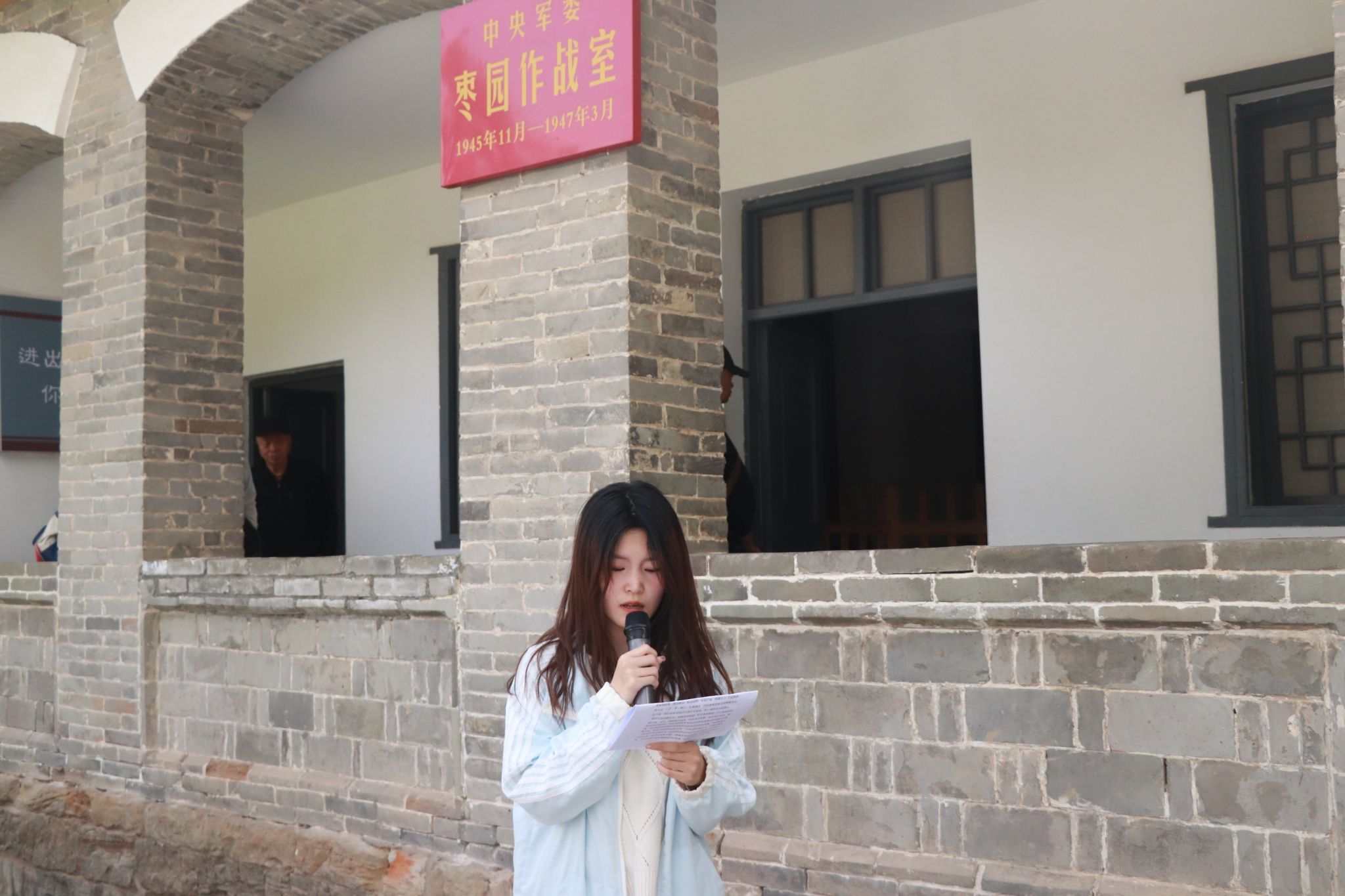 为了增强全体员工党员对枣园革命旧址的认识和了解,更好地领会枣园革命旧址所承载的丰富历史内涵和宝贵革命精神富,主持人在入口处对枣园革命旧址的历史背景做了详细介绍,让同志们了解枣园革命旧址在革命历史中的重要地位。