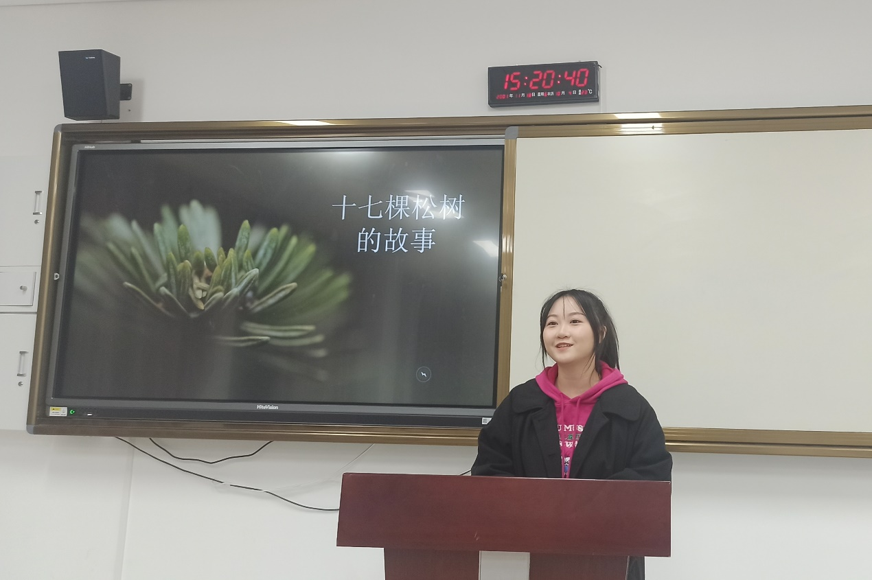 姚坤荣同学向我们讲述的是可歌可泣的十七颗松树的故事,华屋村17名壮士出发前相约栽下的17棵松树,被后人称作“信念树”,以纪念和见证他们当年坚定不移的决心和义无反顾的出征。她用生动形象的语言描述出了战士们不怕牺牲的英勇气魄,同学们听完之后都十分感动,深受鼓舞。