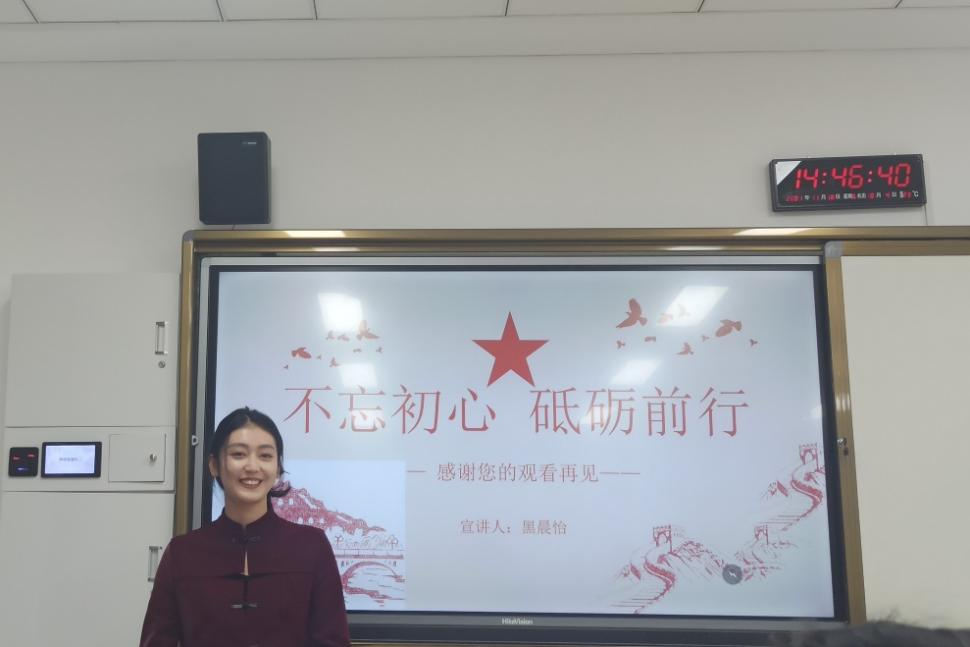 黑晨怡同学的宣讲主题是“回延安,再出发”。她带领我们回忆了二十世纪三十年代培养了大批热血青年、孕育了伟大延安精神的革命圣地——延安,带领我们重温革命战争时期党中央在延安的峥嵘岁月,缅怀老一辈革命家的丰功伟绩。我们可以借着这份精神展望未来,在前行的道路上披荆斩棘。