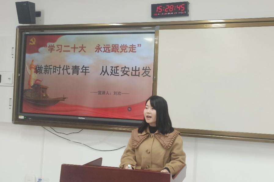 刘欢同学为大家宣讲的主题是“做新时代青年,从延安出发”。 红色是百年奋斗最鲜明的底色,我们将谨记习近平总书记的嘱托,牢牢守好红色血脉,努力学习贯彻党的二十大精神。做有“奋斗样”,有“奉献样”的新时代好青年。