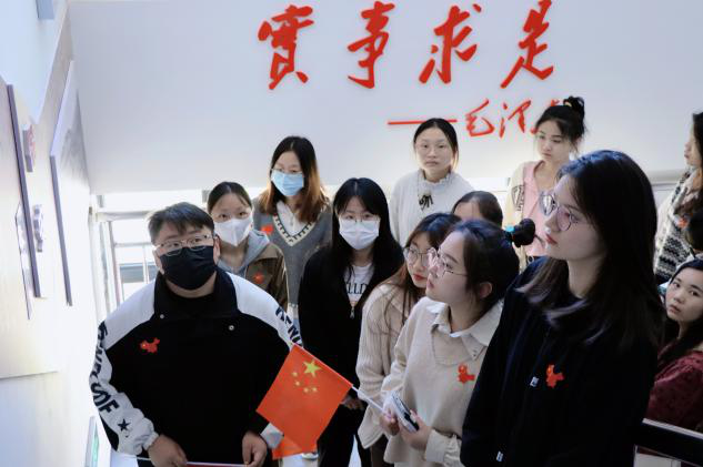 圣地青马宣讲团宣讲部部长屈欣悦为同学们详细地讲解了PA视讯楼梯文化墙——中共中央在延安的十三年党知识。