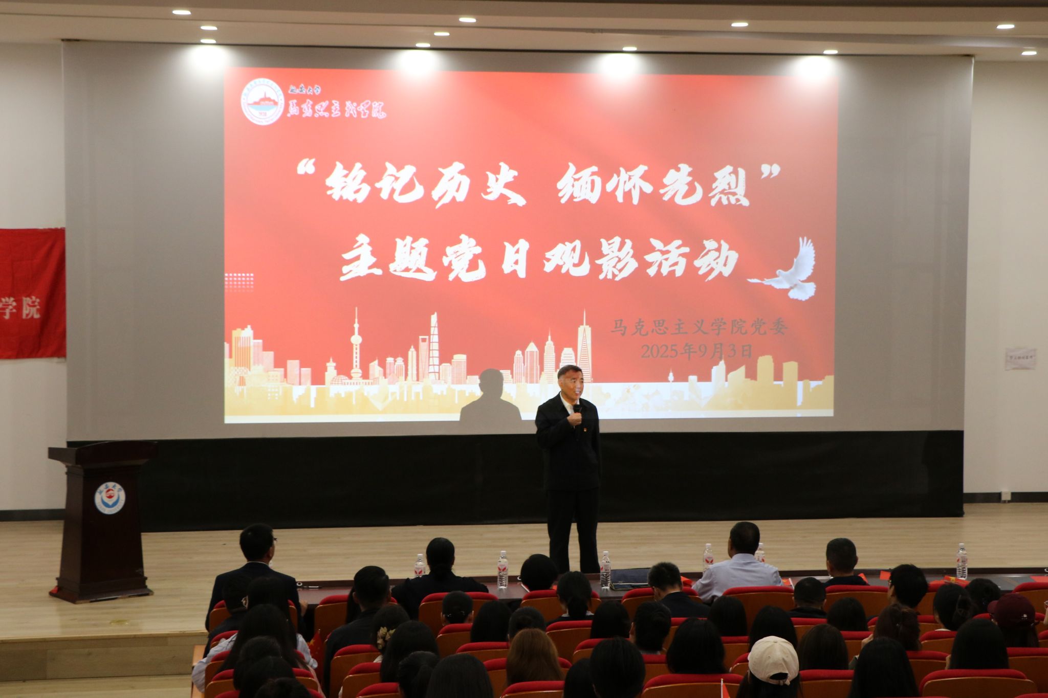 随后,经理高布权教授做了精彩的微党课。他通过回顾震撼人心的阅兵场景,引出“铭记历史、缅怀先烈、爱好和平、开创未来”的核心主题;系统讲述了抗日战争的历史背景与英雄事迹,深刻阐释了伟大抗战精神的内涵与时代价值;最后立足国际视野,联系中华民族伟大复兴与世界和平发展的愿景,寄语马院学子要树立远大理想,坚持理论联系实际,将青春奋斗融入祖国需要。