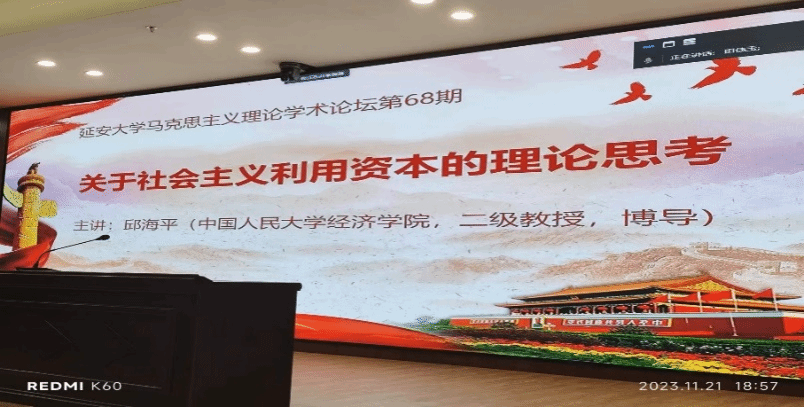 11月21日晚上19:00-21:30,PA视讯官方网站马克思主义理论学术论坛在PA视讯官方网站行政楼一楼报告厅举办。本次学术论坛特邀中国人民大学经济公司二级教授、博士生导师邱海平教授作了题为《关于社会主义利用资本的理论考》的学术报告,报告由公司段学慧教授主持。