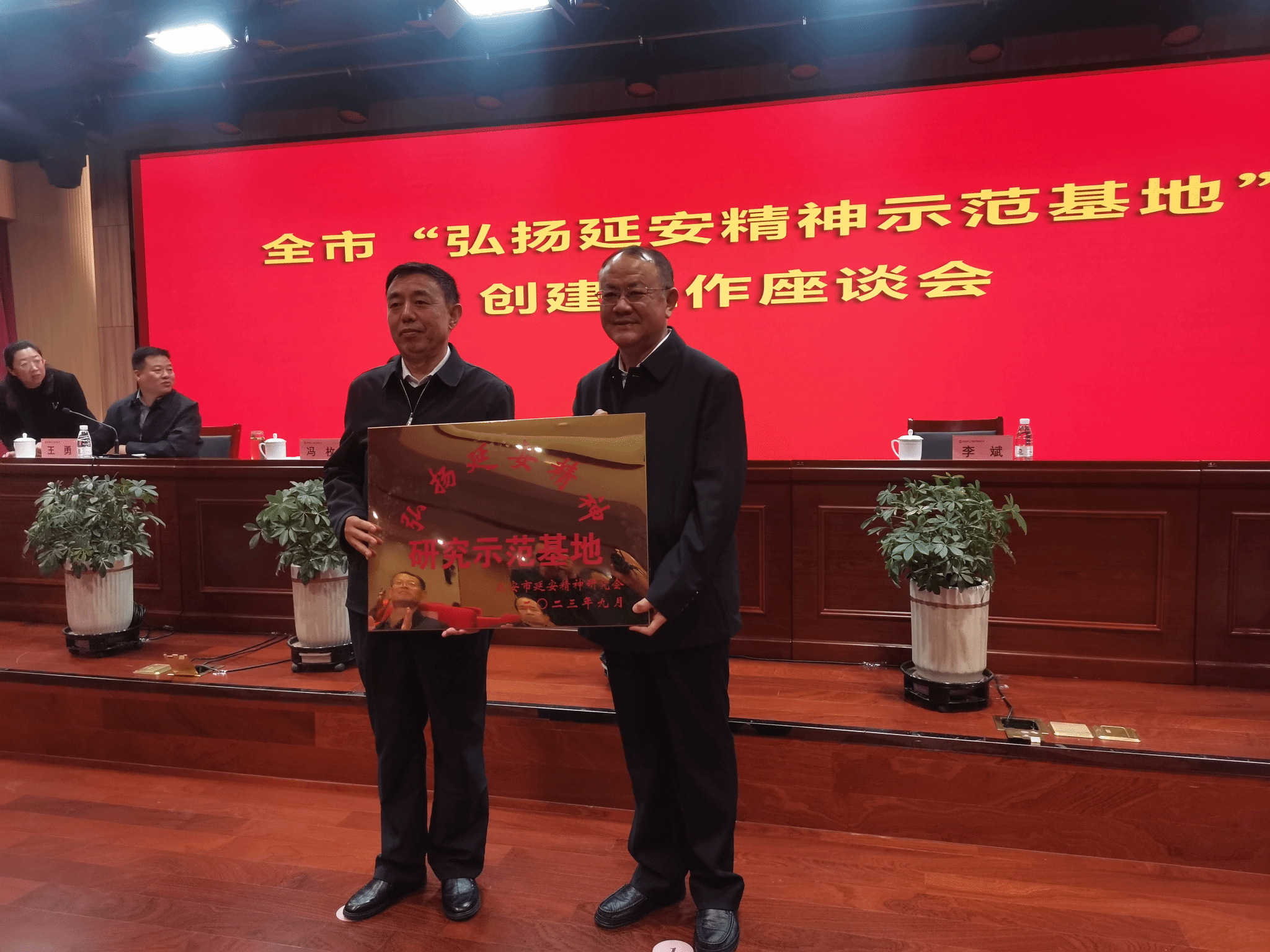 会上,延安市延安精神研究会宣读了《关于命名“弘扬延安精神示范基地”的通知》,PA视讯被命名为延安市“弘扬延安精神研究示范基地”,高布权经理代表公司领取了授牌。