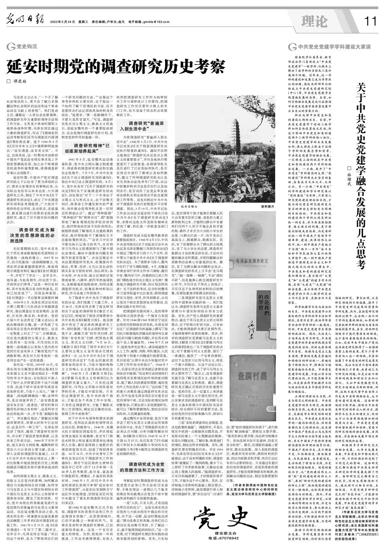 文章坚持逻辑与历史相统一,分四个阶段梳理和考察了党在延安时期开展调查研究的历史,第一阶段是调查研究成为解决党的思想路线的必然选择;第二阶段是调查研究精神“已经逐渐培养起来”;第三阶段是调查研究“普遍深入到生活中去”;第四阶段是调查研究成为全党的思想方法和工作方法。文章认为,延安时期,中国共产党对调查研究较之于以往有了更为深刻的认识,要求从客观存在的事物出发、从实际出发而非从本本出发,大兴调查研究之风,制定了中共中央《关于调查研究的决定》,成立了中央调查研究局和各类调查团,广大党员干部纷纷走出公司,走出机关,走进基层,联系群众进行经常的系统的调查研究,端正了对中国实际问题的认识,熟练掌握了将马克思主义基本原理与中国实际相结合的有力武器——调查研究。