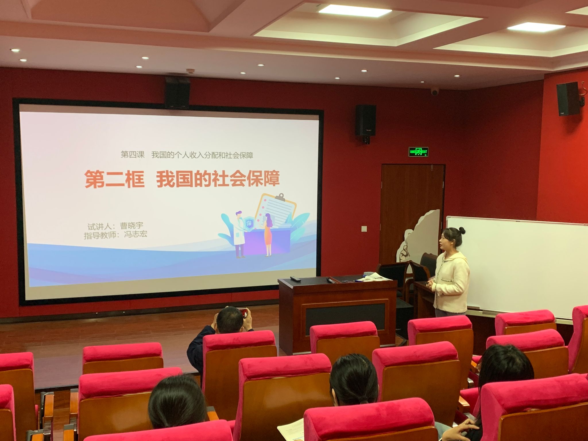 曹晓宇同学试讲的内容是《我国的社会保障》。在教学中对我国社会保障的构成体系、功能以及如何完善我国的社会保障进行了详细的讲解。讲课过程中运用了讲授法、议题式教学法和合作讨论法,引导员工掌握社会保障的主要形式,通过视频导入议题,讲授了社会保障的功能以及完善社会保障的措施。试讲结束后,在教师点评环节,就问题设置的深度进行了充分讨论。杨文军老师做出了评价,首先对其教学的完成度给予了肯定,其次针对授课内容、PPT设计、备课、问题设计、视频选取等方面提出了建议,最后提出在今后的教学中应联系员工实际生活,以员工为中心展开教学设计,进而提升教学效率。