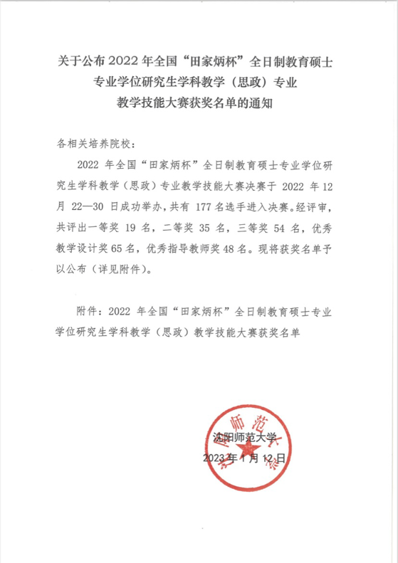 由全国教育硕士专业学位教学指导委员会指导,沈阳师范大学主办的全国“田家炳杯”全日制教育硕士学科教学(思政)专业教学技能大赛于2022年12月22日—24日举办。经评审专家评定,公司2021级学科思政研究生李蓉蓉、赵亚瑞荣获三等奖,王兴兰、袁淑娟荣获优秀教学设计奖。