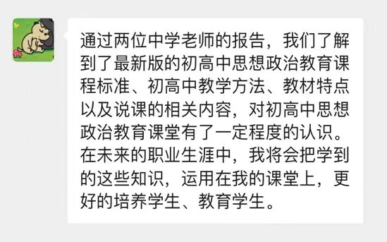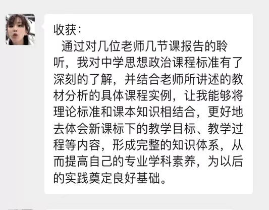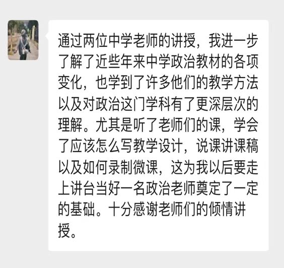 本学期,两位老师为20级师范生作了共计8场报告。前六场由单婷老师主讲,单婷老师分别在9月24日、10月15日和10月29日围绕“初中《道德与法治》课程标准解读”、“教学案例展示”和“如何说课”三个主题为同学们作了分享与交流。后两场由白应健老师主讲,白应健老师分别在11月12日和11月26日围绕“高考改革最新政策分析”、“高中《思想政治》课程标准解读”和“教学课件展示”三个主题为同学们作了分享。