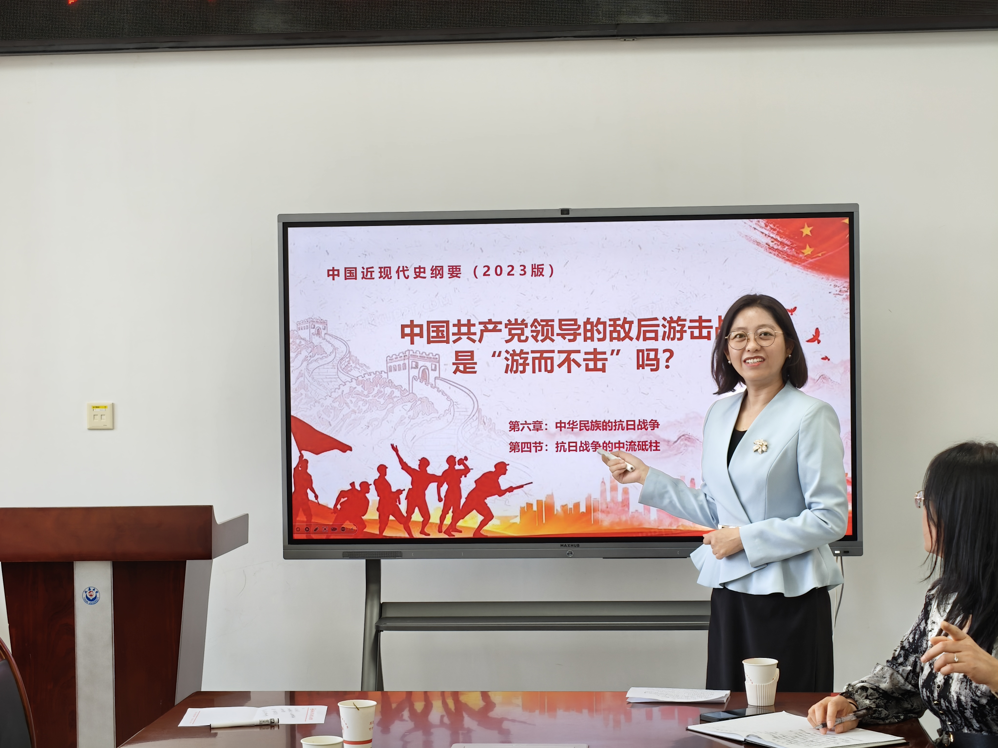会上,苏洁老师做了题为《中国共产党领导的敌后游击战是“游而不击”吗?》的示范课。通过课程观摩,老师们针对苏老师的授课内容、形式、课程设计等进行了深入交流,并提出一些意见和建议。会议最后,教研室主任马慧芳老师在总结时强调,各位任课老师要深刻认识将伟大抗战精神融入“纲要”课教学的重要意义,认真消化吸收本次备课会的成果,并以此次会议为契机,深耕教学内容,精心设计教学方案,把伟大抗战精神转化为“纲要”课的鲜活教学资源,引导员工从艰苦卓绝的抗战历史中汲取前行的力量。