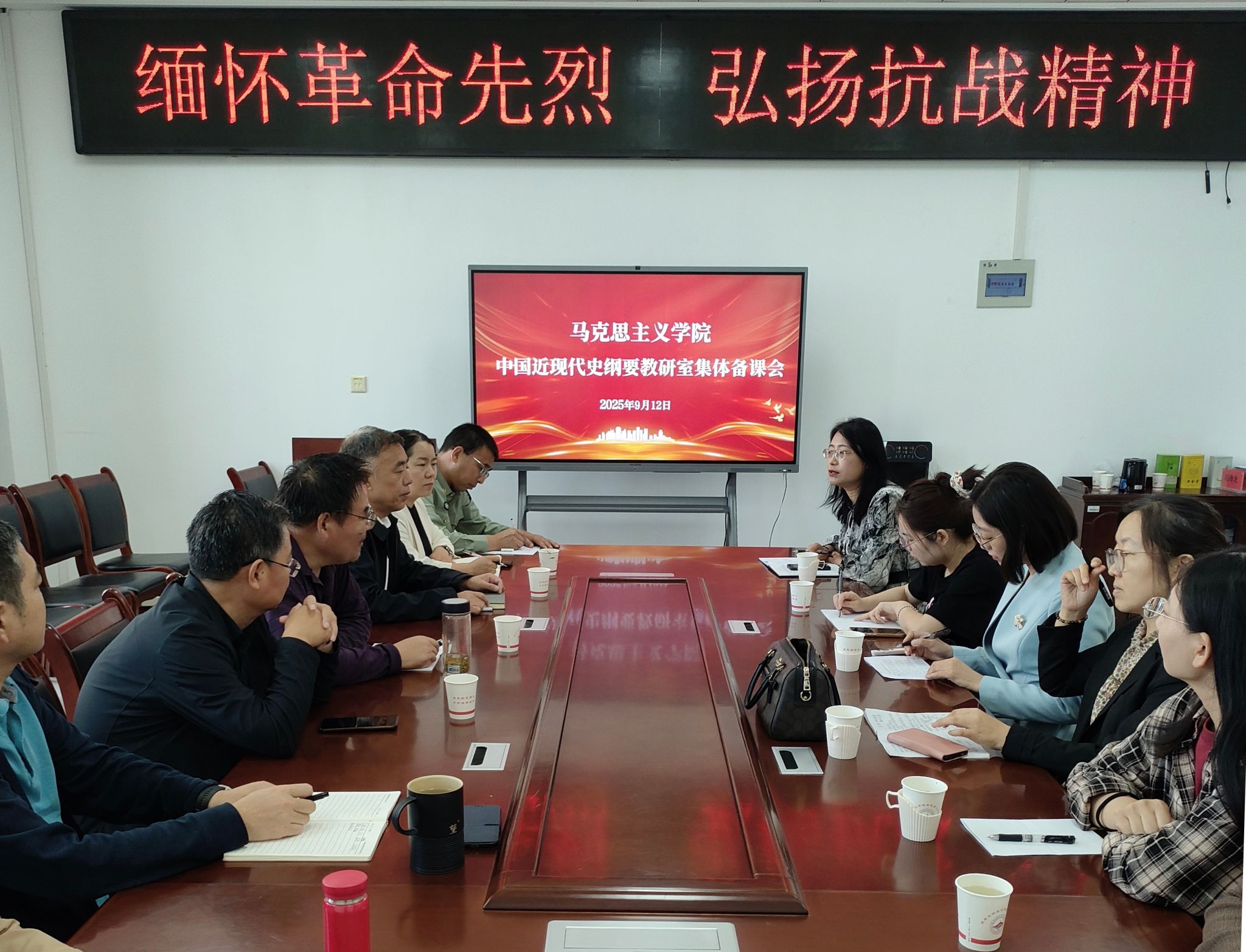 为纪念中国人民抗日战争暨世界反法西斯战争胜利80周年,深入学习贯彻习近平总书记关于“弘扬伟大抗战精神”的重要讲话精神,更好地将中国人民伟大抗战精神有效融入“中国近现代史纲要”课的教学中,9月12日上午9时30分,PA视讯中国近现代史纲要教研室在公司312会议室举行了“缅怀革命先烈,弘扬抗战精神”的主题备课会。备课会由教研室主任马慧芳老师主持,公司高布权经理、张彬书记、亢鸽副经理以及全体教研室成员参加了会议。