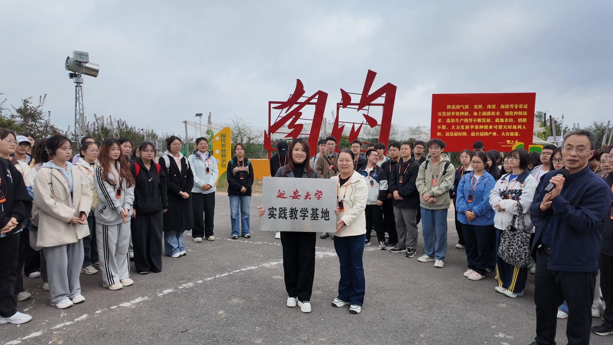 在讲解员的引导下,师生们先后走进南沟故事展览馆与乡村振兴矮化密植果园,重温总书记考察时的细节与嘱托。展览馆中,一幅幅图片、一组组数据,清晰展现南沟村通过“支部引领、合作经营、企业带动、群众参与”的发展模式,生动述说着这片土地从往昔艰辛到今日丰收的变迁故事。在果园里,讲解员详细介绍节水滴灌、精细化管理等现代农业技术,让同学们直观感受到“小苹果”背后蕴含的农业现代化之路。这场边走边看的实地见学,将抽象的发展理念转化为可触可感的现实画卷,使乡村振兴的壮阔图景深入每位同学心中。