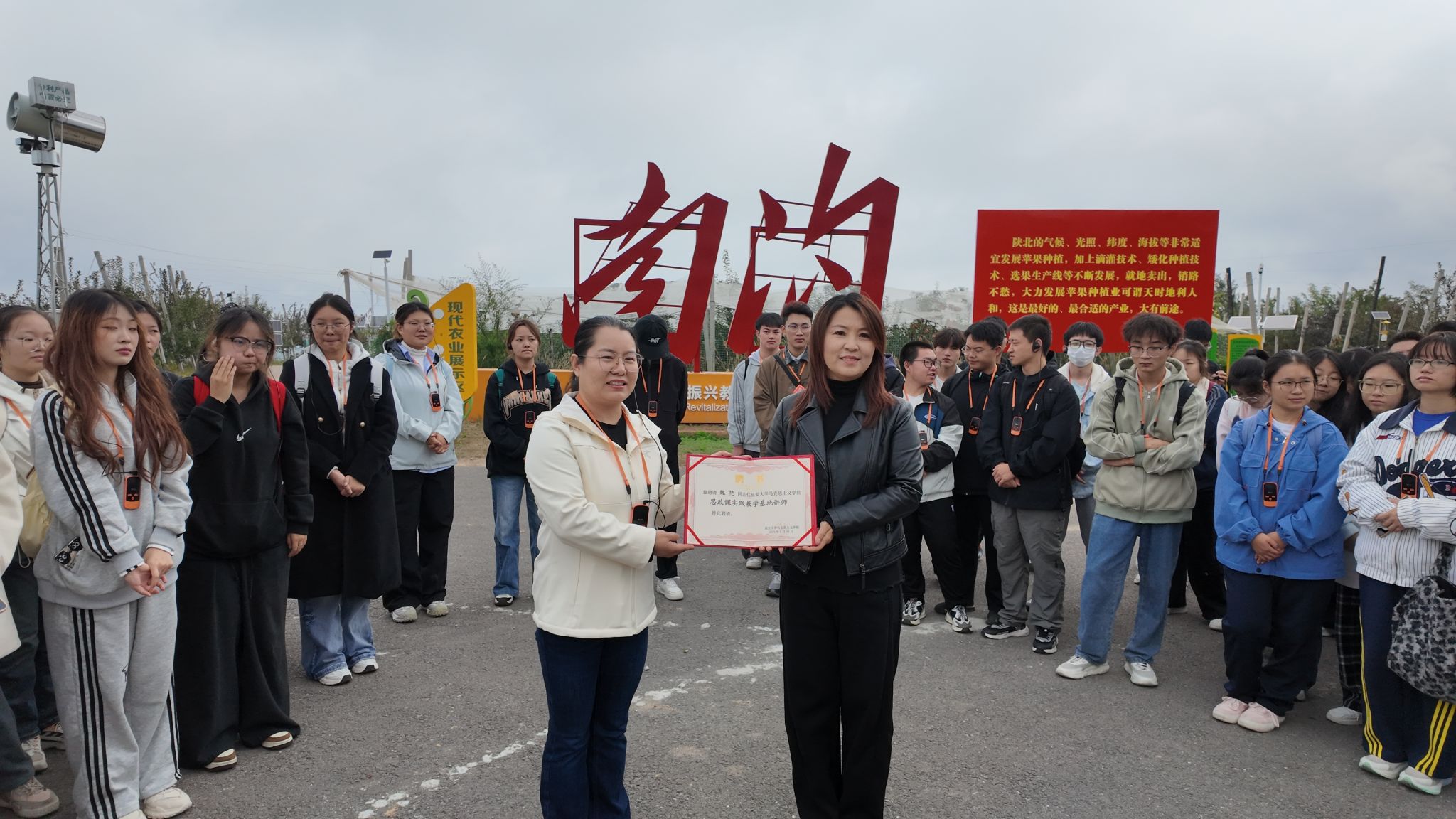 首先,亢鸽副经理代表公司致辞,说明了组织此次实践教学活动的目的和重要意义。同时,她代表公司向延安惠民农业科技发展有限公司总经理魏艳颁授“PA视讯官方网站实践教学基地”牌匾及“实践教学指导老师”证书。魏艳总经理愉快接受并承诺将全力开放资源,与师生共同开发更多实践课程,让南沟村成为思政教育的鲜活教材。这一仪式的成功举行,为思政教育工作注入深厚的乡土底蕴与实践动能。