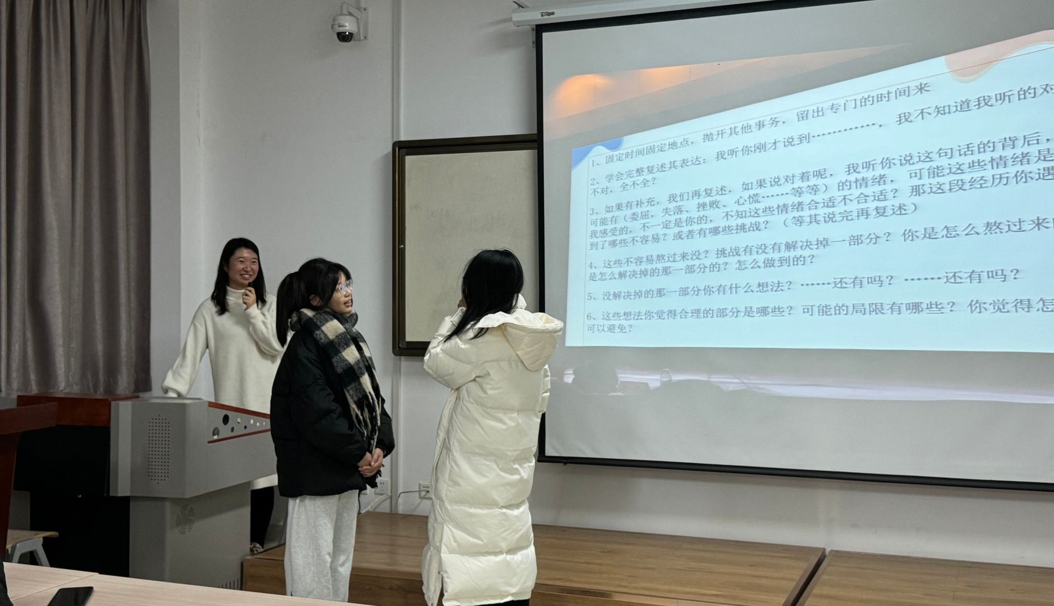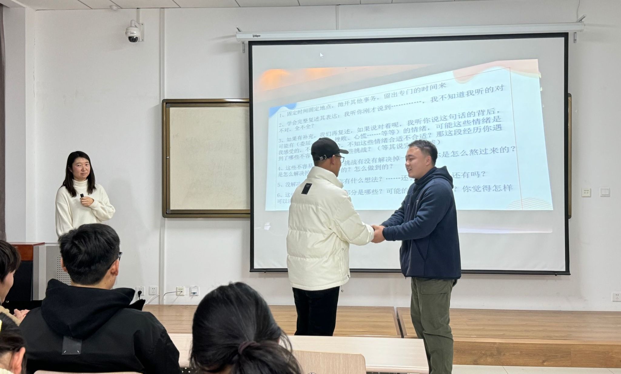 培训期间,高雨薇老师着重从心理委员与宿舍长的职责以及工作中的话术训练这两大方面展开讲解。她指明,心理委员的主要职责在于全力维护班级同学的心理健康,并协助教师宣传且开展各类心理健康教育相关活动。而在话术训练环节,高老师采用模拟对话的形式,悉心教授心理委员和宿舍长怎样以适宜的语言与态度和同学们展开沟通,同时着重强调了同理心在沟通进程中的关键作用。她还列举了一些开场白和结束语的范例,助力同学们在对话时构建信任与尊重的良好氛围。高老师积极鼓励同学们提出内心的疑问与困惑,并逐一进行了现场解答。最后,她再次强调心理委员和宿舍长是公司心理健康教育体系的重要构成部分,期望同学们持续强化学习,成为同学们更为出色的心理健康守护者。