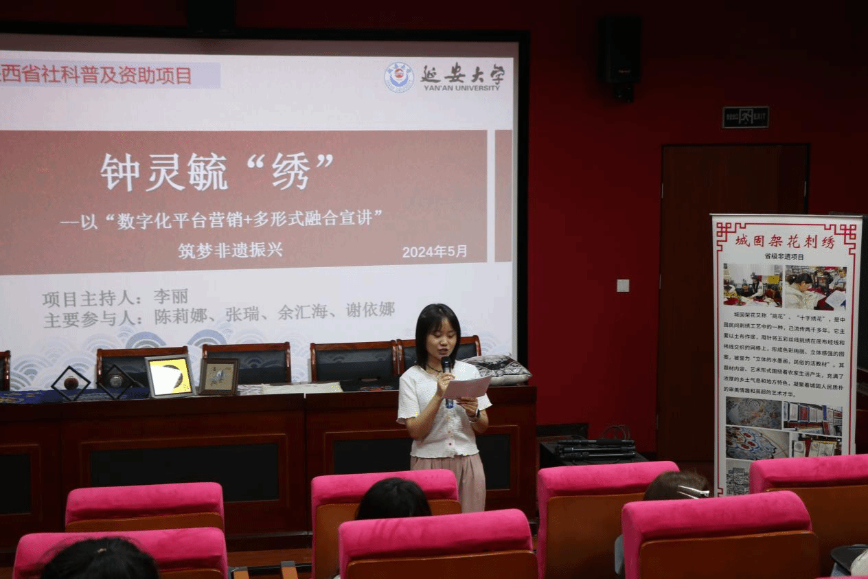 活动第一项,由宣讲团成员代表进行非遗文化的宣讲,介绍省级非物质文化遗产“城固架花”刺绣的历史及传承现状。宣讲团成员在介绍架花的过程中说道:“随着现代生活方式的变迁和市场需求的改变,城固架花在一定程度上遇到了发展困境。传统手工艺人才的培养受到了一定的影响,从而城固架花传统工艺人才日渐稀缺,城固架花产品的市场需求受到也受到了影响。”因此,她建议我们需要不断创新城固架花的传统艺术产品,将刺绣艺术与现代设计相结合,创造出更具时代特色和市场需求的作品。