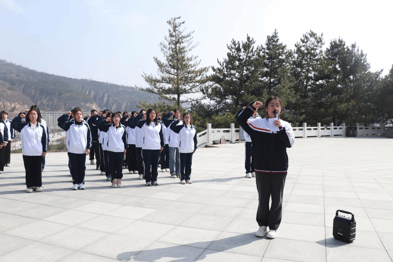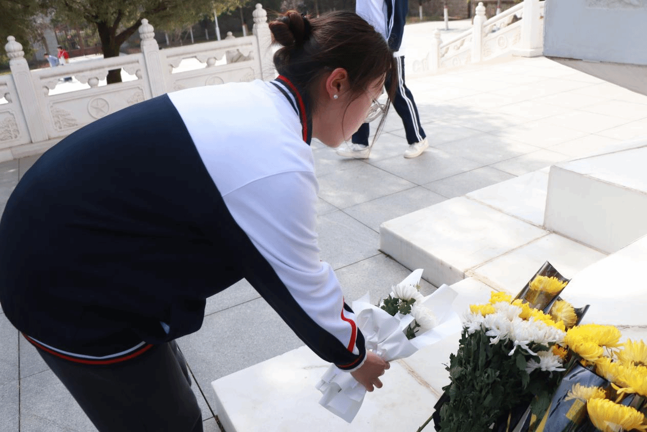 青山有幸埋忠烈, 浩气无形化丰碑。在纪念碑前,同学们庄严肃立,马玉同学带领大家行鞠躬礼,并带领大家宣誓。庄严的时刻,郑重的誓言,不能忘的是革命先烈的精神意志,不能舍的是革命先烈的光荣传统,不能停的是接续创造的辉煌业绩。