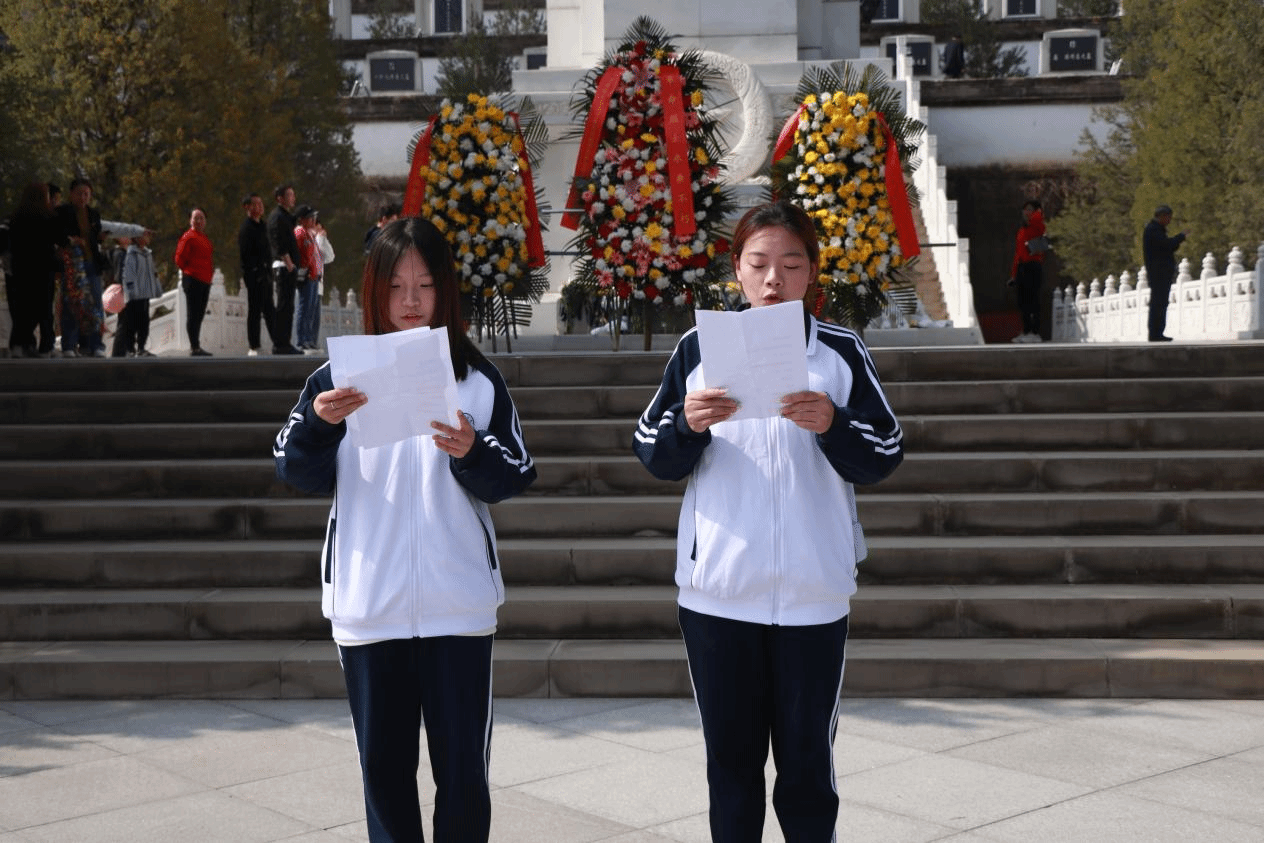 吴苏怡同学和李雨珂同学合诵《清明》,王思雨同学和孟申奥同学合诵《清明》。“清明时节雨纷纷,路上行人欲断魂。”在烈士墓前,在四月的春风里,在他们的朗诵中,悲情从字里行间流出,将对烈士的哀思与敬仰传递给每一位在场的同学。
