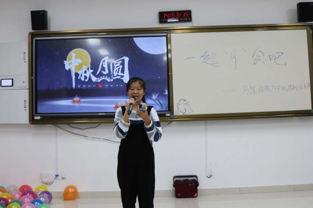 晚会在陈思敏同学和王博强同学的朗诵《中秋之夜》中拉开了序幕,声音浑厚的男声与喉清韵雅的女声把同学们带入晚会的氛围。高宇飞同学和张恒弢同学表演相声《满腹经纶》,幽默的相声不仅令台下同学捧腹大笑也蕴含着胸中万千文章,才能做到满腹经纶这一深刻人生哲理,极具教育意义。覃生耀同学模仿新闻主持唯妙唯俏,令台下观众佩服至极。