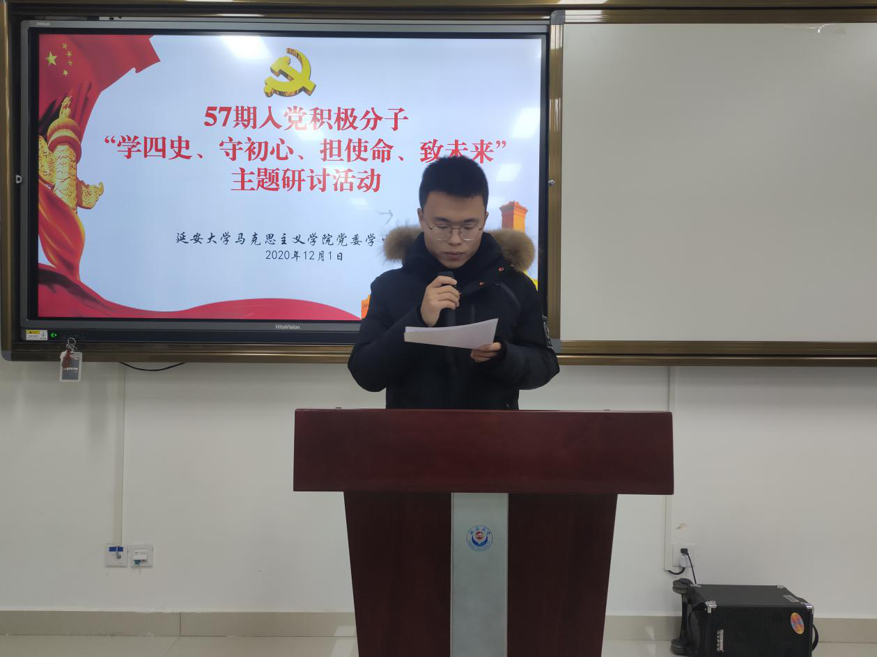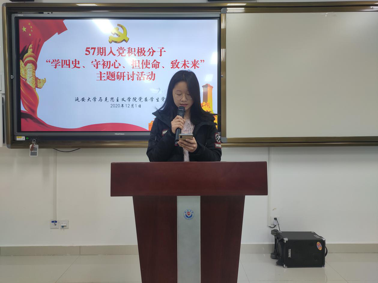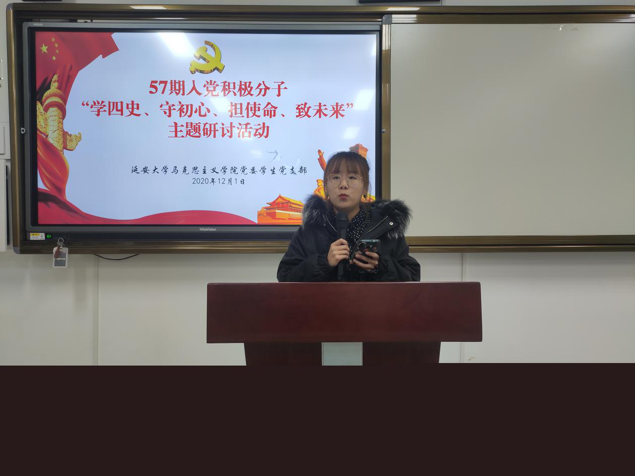 “担使命、致未来”线上研讨会于2020年12月1日在积极分子培训群举行,由员工党支部纪检委员贺宁宁同学主持。首先,由贺宁宁同志向参会积极分子介绍本次研讨内容:1、分享学“四史”心得体会;2、结合自身实际谈谈如何争做一名合格的中国共产党党员;3、分享相关主题视频及报道。