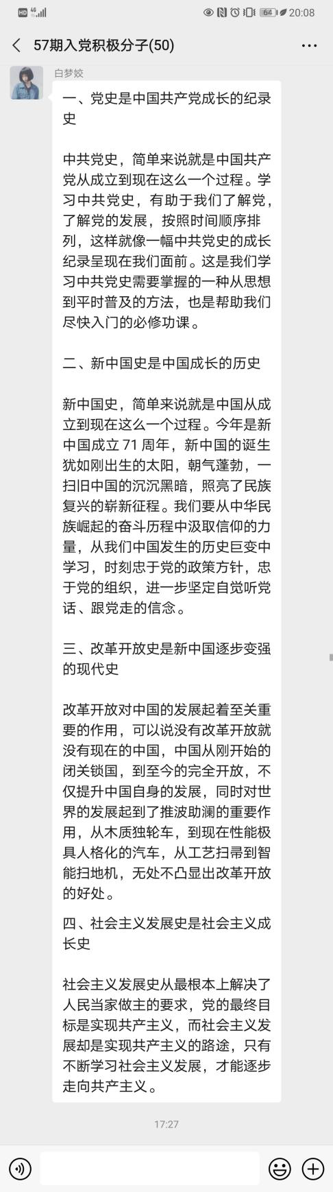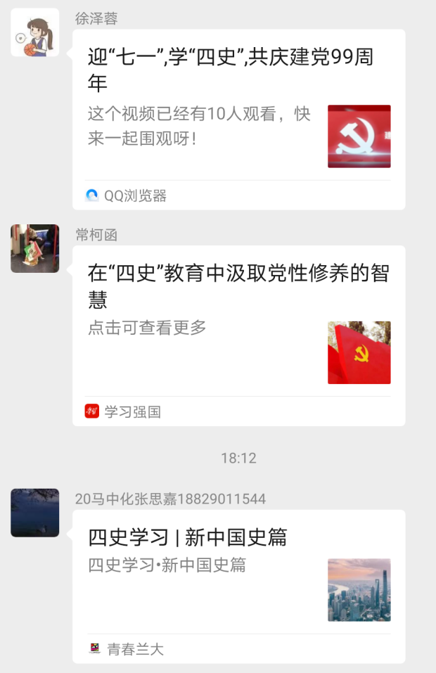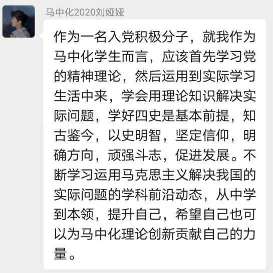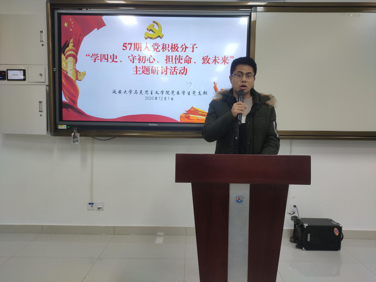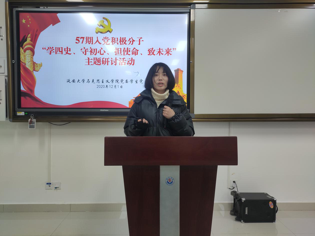 “担使命、致未来”线上研讨会于2020年12月1日在积极分子培训群举行,由员工党支部纪检委员贺宁宁同学主持。首先,由贺宁宁同志向参会积极分子介绍本次研讨内容:1、分享学“四史”心得体会;2、结合自身实际谈谈如何争做一名合格的中国共产党党员;3、分享相关主题视频及报道。