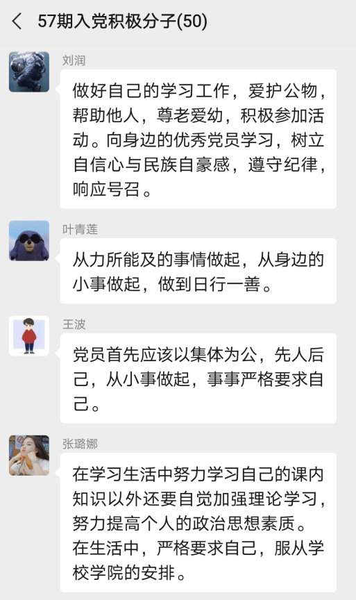 57期入党积极分子“学四史、守初心、担使命、致未来”主题研讨活动圆满结束。参会同学一致认为,本次主题研讨活动对于端正入党动机、加强“四史”教育和对党的认识等都具有重要意义,并表示在以后的学习生活中,将会恪守初心、践行使命,提升理论水平,争取早日加入中国共产党!
