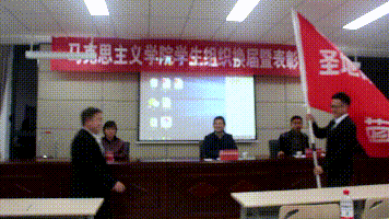 第五项,原圣地青马宣讲团团长白亚平向圣地青马宣讲团团长董阳交接旗帜。
