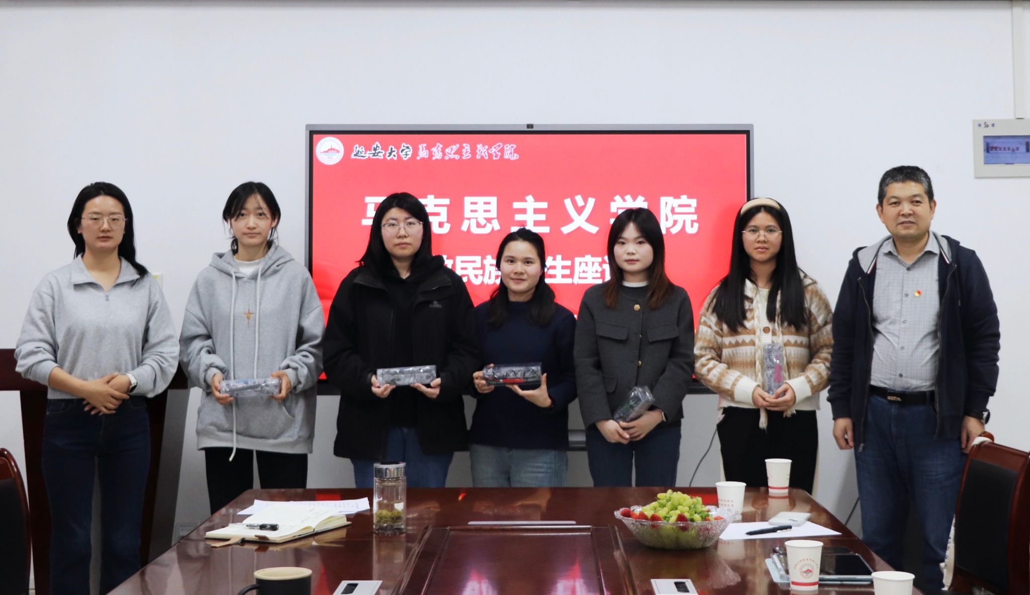 在座谈交流环节,不同地域和民族的员工代表既展现民族特色与传统风俗,又结合在校成长经历畅谈学业收获与成长体悟,更聚焦现实关切,围绕“马克思主义民族文化传承创新”“民族文化实践平台搭建”等具体问题展开探讨。苗玉园老师肯定了同学们将理论学习与实践探索相结合的研究思路,并就问题作出回应,强调要立足马克思主义唯物史观,在坚守民族文化核心价值的同时探索创新路径,在沉浸式体验中读懂民族团结进步的当代价值。