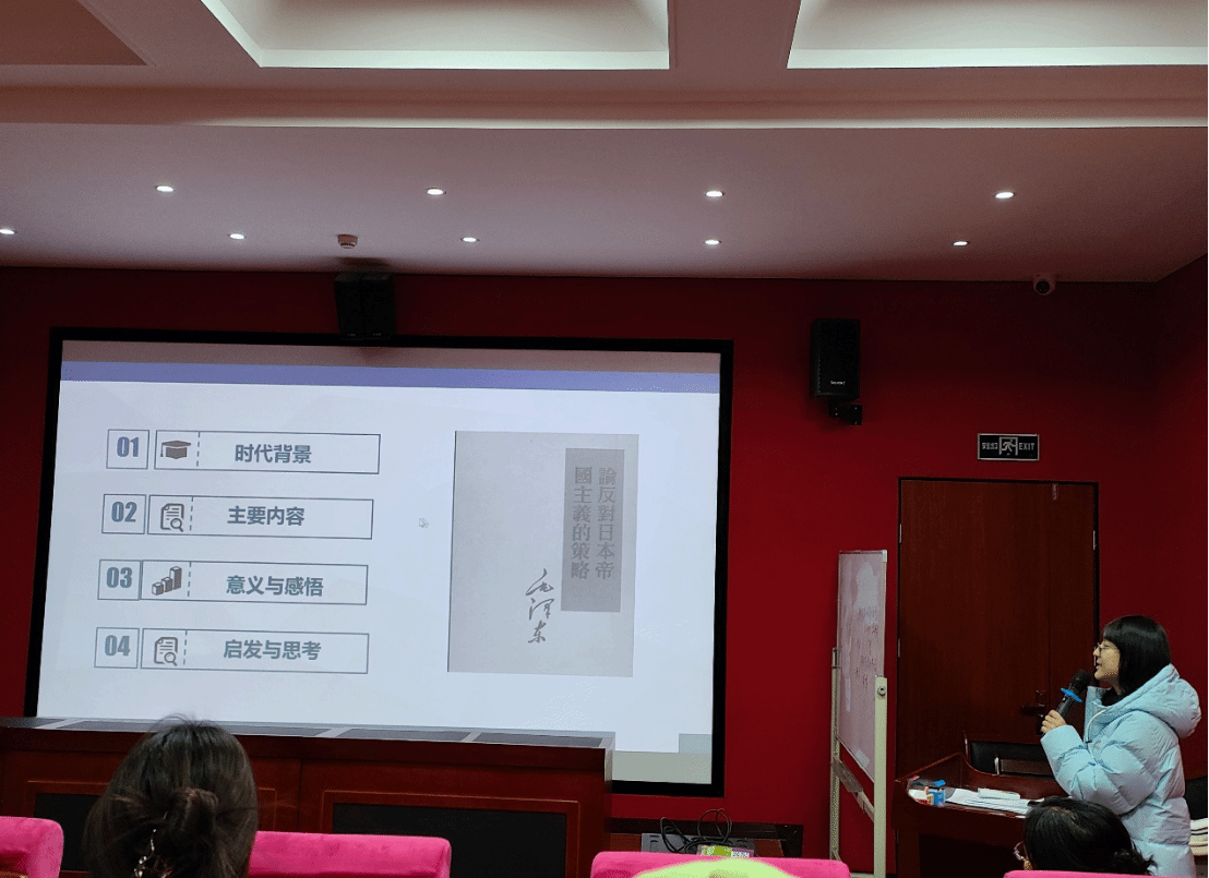 之后她给大家分享了几点:首先要多读书,读经典著作;其次要读好书,并指出读书要与历史的学习结合在一起,可以画时间轴,或看地图去读;最后,她引用毛泽东同志说的“我们总要努力!我们总要拼命的向前!我们黄金的世界,光华灿烂的世界,就在前面!”作为结尾,勉励大家,希望我们能只争朝夕、顽强奋斗、不负韶华。