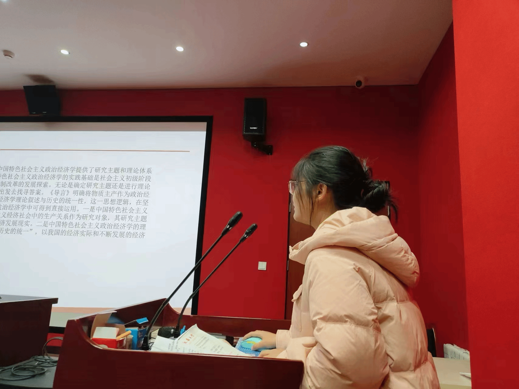 《导言》的内容主要由三部分组成,第一部分是政治经济学的出发点和研究对象,在这部分马克思开篇就指出政治经济学研究的出发点是社会物质生产,批判了资产阶级经济学家把孤立的人当做研究的出发点的错误观点。第二部分是生产分配交换消费的辩证关系,在这部分马克思运用辩证唯物主义观点批判了资产阶级经济学家割裂四个环节的观点论述了生产、分配、交换、消费四个环节是相互联系而相成的有机统一体,确定了生产在社会经济生活中起决定作用的原理,进一步阐明政治经济学研究对象。第一部分是政治经济学研究方法,在这部分马克思论述我们应运用从抽象上升到具体的方法来研究政治经济学。韩瑶瑶同学还依次介绍了生产、消费、分配、交换的辩证关系,生产与消费的辩证关系,生产与消费的同一性与斗争性。最后指出《导言》的重要的理论价值和时代价值,《导言》对于我们领悟马克思思想的力量、研究马克思思想的发展,特别是推动中国特色社会主义政治经济学的发展有着重要的指导意义。