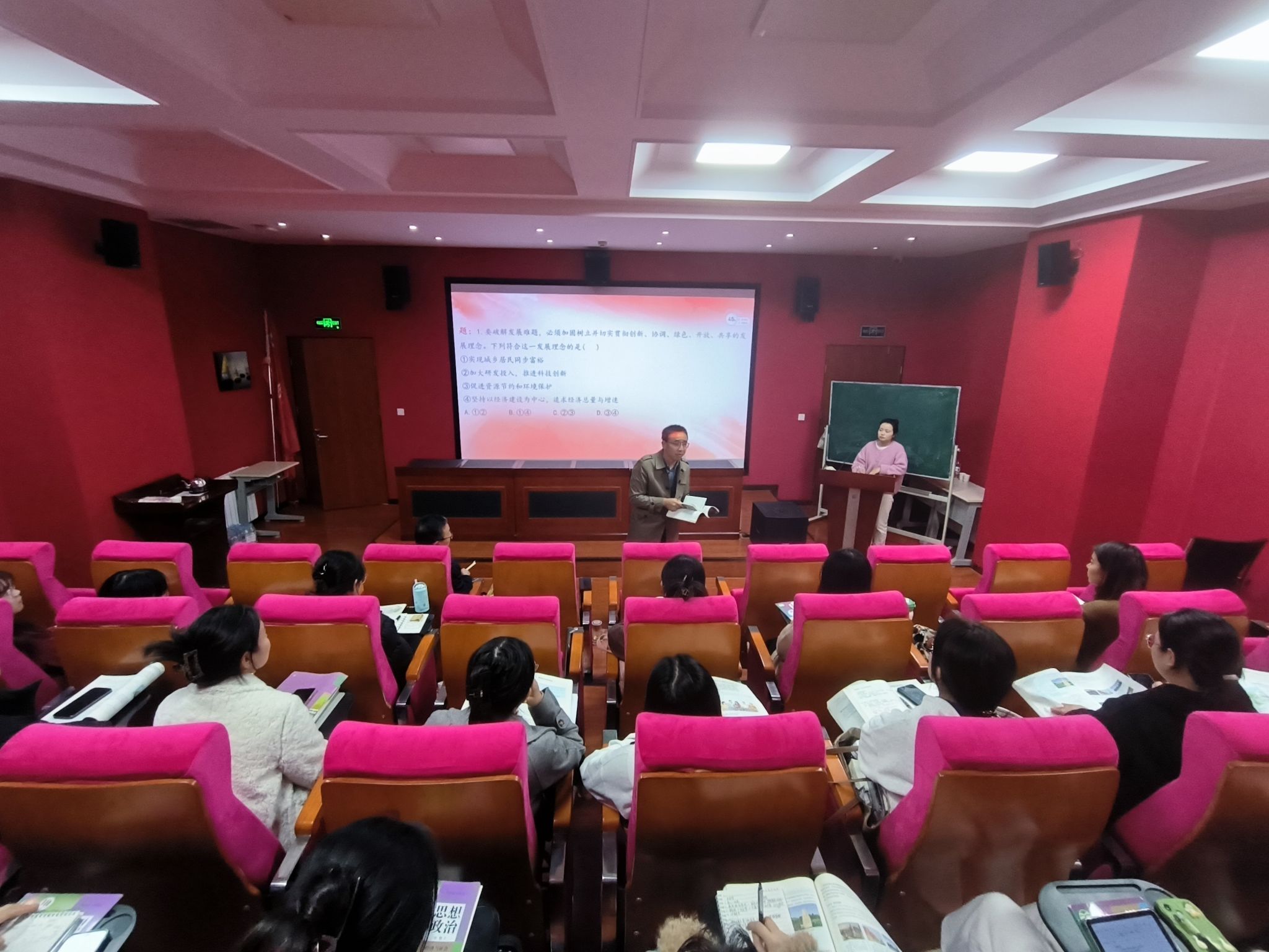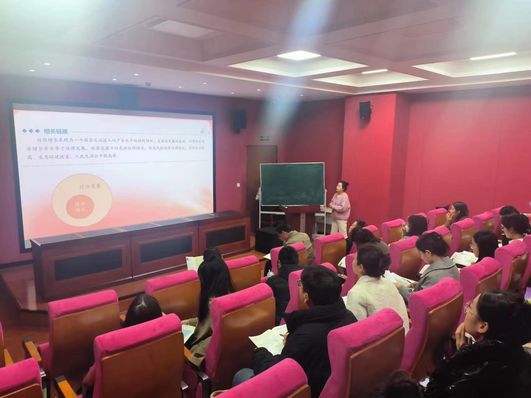 李娜娜同学试讲的是高中政治必修二的《坚持新发展理念》。她主要通过案例和思考题来引导同学们认识新发展理念的内容及其内部关系。课程中分别运用了讲授法和讨论法以及合作探究法等,使员工明确了新发展理念的具体内容,以及如何贯彻新发展理念。课程中还强调,要对五大新发展理念的具体内容有所区分。试讲结束后,在教师评价环节,杨文军老师和赵海龙老师就讲课方式等问题进行了指导,对教学环节的内容安排指出了不足之处,叮嘱在今后要加强知识积累以应对课堂中的各种问题。