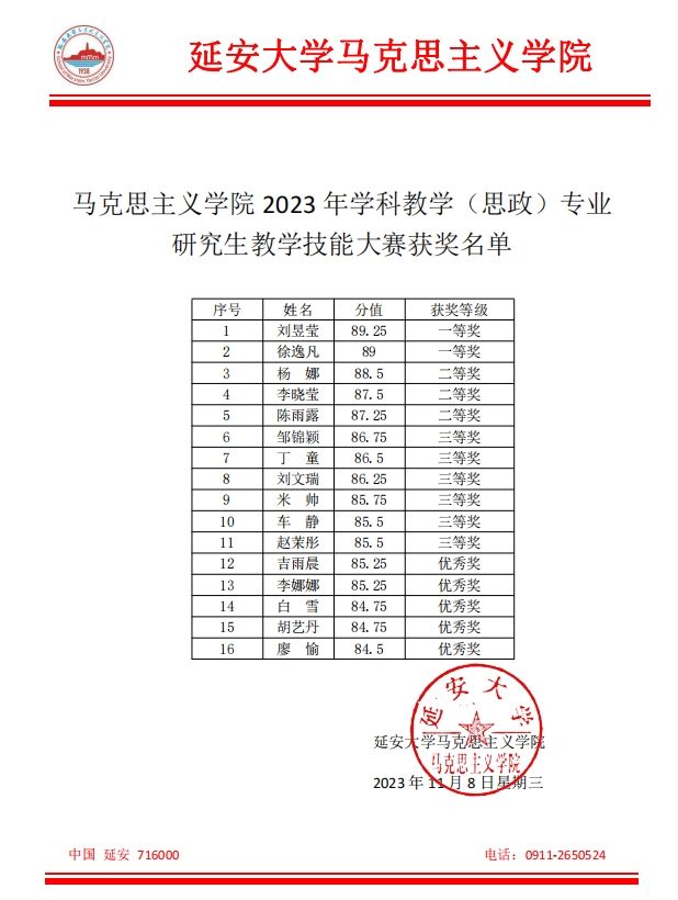 经过综合评审评选出一等奖两名,二等奖三名,三等奖六名,优秀奖五名。评委老师们为获奖员工颁奖并合影留念。在本次比赛中,26位同学表现优异,各具特色,切实提升了对学科专业的认识,认知到自身的不足,为日后的专业知识与技能的学习起到了积极作用。本次2023级学科教学(思政)专业研究生教学技能大赛圆满结束!