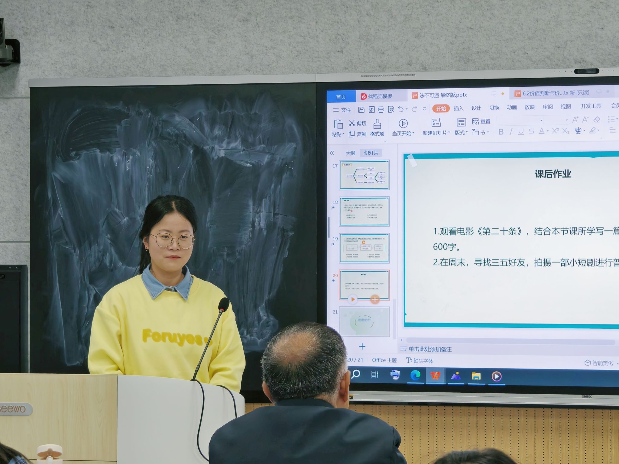 2025年4月16日,学科思政24全体同学于202智慧教室开展了教学技能实训的第十五期活动。本次实训活动讲课人为何嘉玲和曹慧慧两位同学。讲课的内容分别是七年级下册《道德与法治》第四单元第十一课第一框《法不可违》和高中政治必修四第六课第二框《价值判断与价值选择》。
