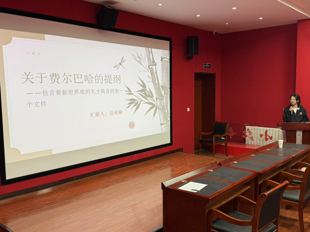 第一位分享人边亚楠,她从写作背景、主要内容、文献综述、哲学地位四个方面来解析《关于费尔巴哈的提纲》一文。首先,她从三个方面阐述了《提纲》的写作背景。其次,全面的讲述了著作主要内容,把著作的十一条内容总结为五个方面,分别是:旧唯物主义的根本局限性;检验科学真理的根本标准;旧唯物主义不彻底的根源;人的本质;新唯物主义和旧唯物主义的本质区别。接着她梳理了关于这篇文章的文献综述,最后她指出了《提纲》的哲学地位,《提纲》表明马克思不仅同唯心主义,而且同旧唯物主义彻底划清了界限,为创立新世界观奠定了基础,被恩格斯誉为“包含着新世界观的天才萌芽的第一个文件”。
